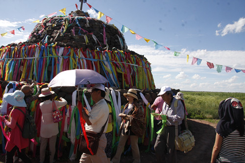 参加“情系燕赵”活动的台湾嘉宾按照蒙古族风俗在敖包祭祀(中国台湾网 芜同 摄)