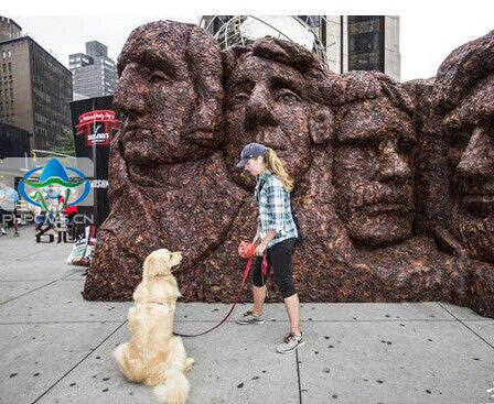美国纽约,美国杰克林克糖心公司为庆祝6月12日举办的第三届国际牛油干节,用肉干仿造美国拉什莫尔山(美国总统山)的总统雕像,场面非常壮观。