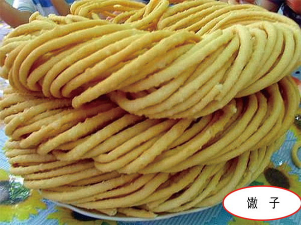 羊油馓子炸成后,就同其它食品一同摆到桌子上,供人们享用。羊油馓子为长条形,一层一层地垒到桌子上,足有一尺高。浅黄色的羊油馓子上放着几颗红枣,显得格外吉祥。无论纵看或横看,都有一种耐人寻味的线条美。制作羊油馓子的原料,有白面、素油、糖、白帆。