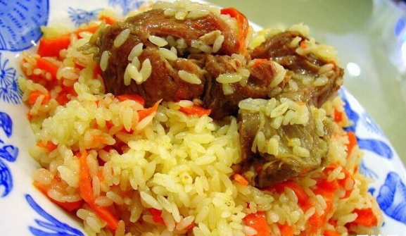 关于抓饭还有一段动人的传说。相传在一千多年前,有个叫阿布艾里.依比西纳医生,在他晚年的时候,身体很虚弱,吃了很多药也无济于事,后来他研究了一种饭,进行食疗。他选用了牛羊肉、胡萝卜、洋葱、清油、羊油和大米加水加盐后小火焖熟。这种饭具有色、味、香俱全的特点,很能引起人们的食欲。于是他早晚各吃一小碗,半月后,身体渐渐地恢复了健康,周围的人都非常惊奇,以为他吃了什么灵丹妙药。后来,他把这种“药方”传给了大家,一传十,十传百,便成为现维吾尔族人普遍吃的抓饭了。这个传说是否真实,我们且不去考究,但抓饭是一种营养十分丰富的食品,却是实实在在的。清油、黄油、洋葱、胡萝卜和大米都是含多种维生素的补品,特别是胡萝卜被人们称为“小人参”和“地参”。用这样的原料做的饭,当然补人了。