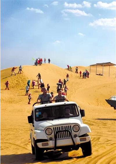 目光远及,一个个沙丘像连绵起伏的波浪,仿佛能看到有似水的沙砬,正在轻缓地流动着,流过沧海桑田,依然容颜如初。游客们可以坐上沙漠冲浪车开始沙漠探险,起落的巨大反差,流线型的急速折返,经历了上坡前车体几乎竖直着与沙坝平行的立于沙坡底部又冲上顶峰时的雄伟气魄,感受了下坡时将人体与车身一齐扔向空中做几近自由落体运动时的惊心动魄。沙海的跌宕起伏令游客们狂热的激情达到了极致,不时有游客发出得意的吼叫,或是爽朗的笑声,那声音便可以越过云端,传到九霄云外……沸腾了整个银肯塔拉。