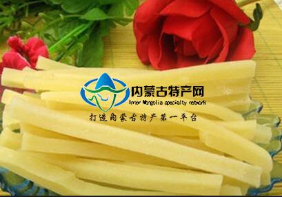 硬质酸奶酪,主要是蒙古族居民所生产与食用,也是他们十分喜爱的一种奶食品。他们所生产的奶酪,又俗称“酪蛋子”,奶酪条,是蒙古居民,在制作干奶酪时候,压制成条状,便于携带,以及储存。压制成条状,也利于方便食用。 奶酪,分生奶酪和熟奶酪两种。 生奶酪的做法是,把鲜奶倒入筒中,经过翻搅提取奶油后,将纯奶放置在热处,使其发酵。当鲜奶有酸味后,再倒入锅中煮熬,待酸奶呈现出豆腐形状时,将其舀进纱布里,挤压除去水份。然后,把奶渣放进模具或木盘中,或挤,大多都在行囊中放几块奶酪,以防不测,备以充饥解渴。 压成形,或用刀划成方块,生奶酪就制做成功了。 熟奶酷的做法与生奶酪的做法略有不同。制做熟奶酪时,先把熬制奶皮剩下的鲜奶,或经过提取奶油后的鲜奶,放置几天,使其发酵。当酸奶凝结成软块后,再用纱布把多余的水份过滤掉,放入锅内慢煮,并边煮边搅,待呈糊状时,将其舀进纱布里,挤压除去水份,然后,把奶渣放进模具或木盘中,或挤压成形,或用刀划成不同形状。奶酷做成后,要放置在太阳下,或者通风处,使其变硬成干。 对于奶酪条,也可以制作成菜肴。